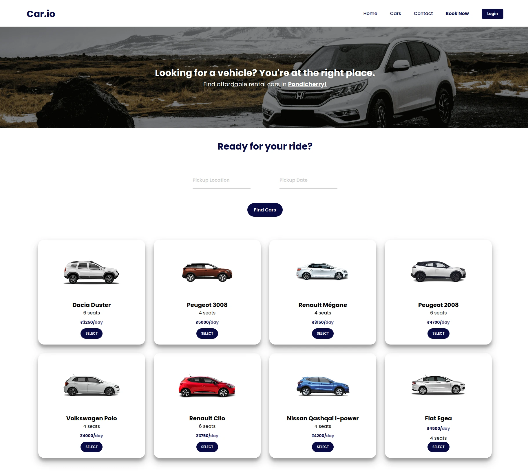Car.io is a sleek, modern, and user-friendly car rental platform specifically designed for finding affordable rental cars in Pondicherry. Whether you're a local or a tourist looking for a zippy ride to explore the town, Car.io provides an easy-to-use interface to book your next vehicle.